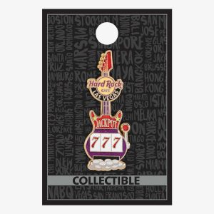 Las Vegas Jackpot Guitar Pin HIT THE JACKPOT! Celebrate your wins with this Las Vegas Jackpot Guitar Pin! Featuring a guitar shaped slot machine with handle and its screen featuring triple 7s and a fortune of coins flowing out of its slot. Plus, the Hard Rock logo emblem at the center with the Vegas city…