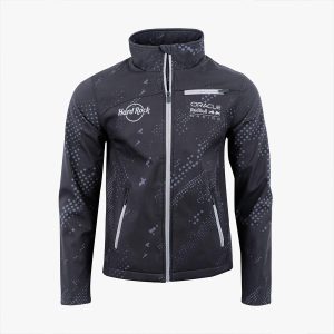 A reverse coil zipper creating a smooth finish . Three security zipper pockets. Featured with embellished prints. Full – length grey zipper with black plastic tipped zipper pull and a stand up collar. Hard Rock & Oracle Red Bull co – branded logos.