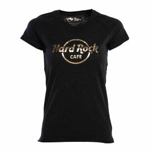 Women’s Gold Thread and Foil Logo Tee Introducing our Hard Rock Cafe-inspired women’s baby doll slim fit tee in bold black, adorned with dazzling gold foil and playful confetti sprinkles. Glittering metallic thread woven into lurex fabric and a gold foil logo and city name make this a statement tee that’s sure to capture your…