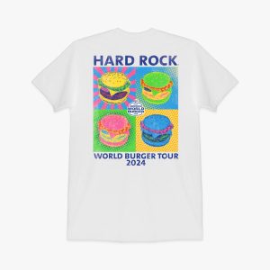 World Burger Tour 2024 Pop Art Tee in White Enjoy wearing this pop art inspired 2024 Hard Rock World Burger Tour tee. Just your everyday smooth and comfortable tee that adds a great s tyle to your wardrobe for you to celebrate in June the diverse flavors of the Hard Rock burger menu.