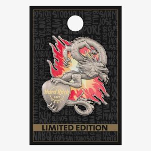 3D Dragon and Flag Guitar Pin Wickedly fun. 3D treatments in antique brass, copper or silver highlight a different dragon for each version as it wraps itself around the guitar neck and base, which doubles as the flag of your chosen location.