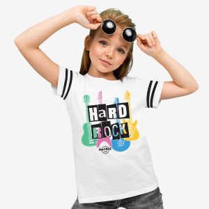 Elevate your child’s style with our White Rock Kids Ringer Tee by Hard Rock. Featuring vibrant cutout letters, thin black sleeve stripes, and a short sleeve crewneck style, it’s perfect for the coolest kids on the block!