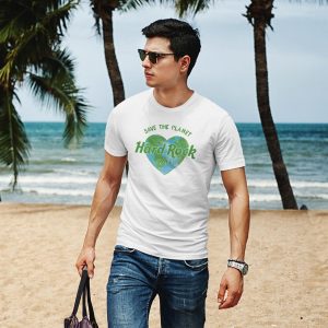 Discover the Hard Rock Save the Planet Tee—white short sleeve with globe heart graphic and iconic logo, made for comfort and conscious style.
