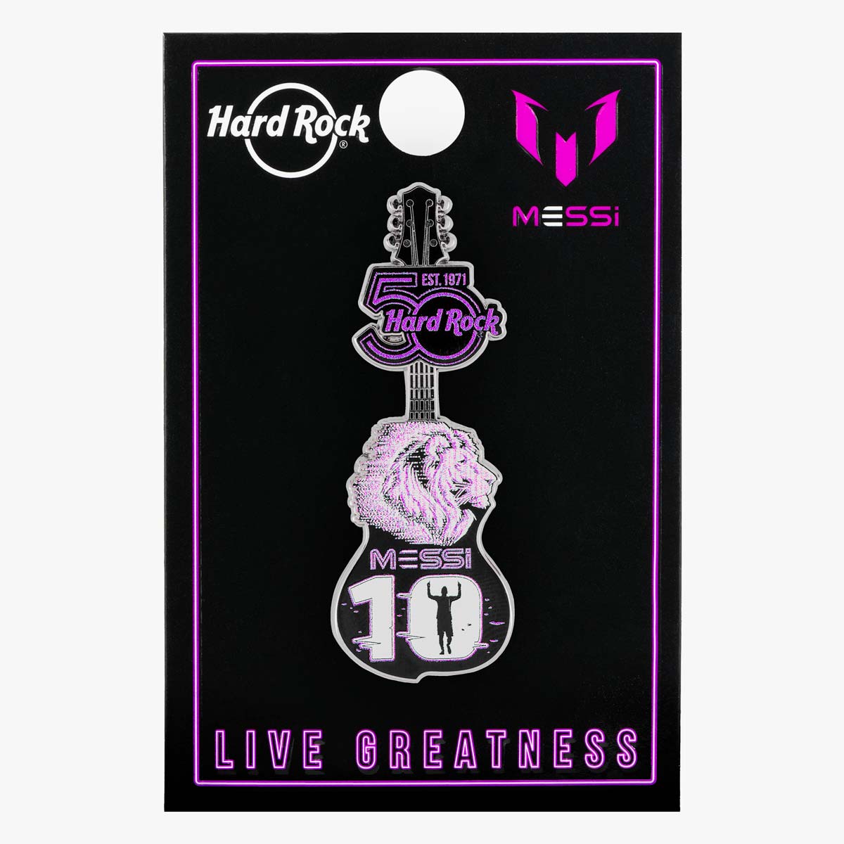 Messi Limited Edition Pin with Lion Head Guitar and Number 10 Design Live Greatness, like Messi plus, celebrate our 50th Anniversary with this Special Edition pin – featuring a Messi lion design and the number 10 wirth a guitar base and special 50th Anniversary logo below the headstock.
