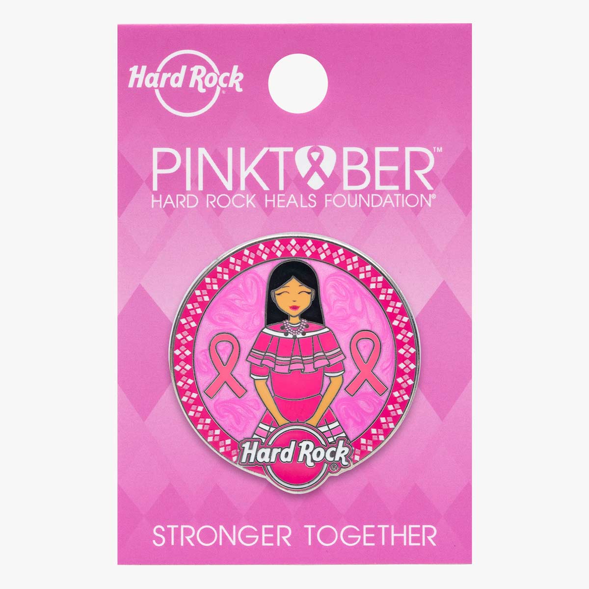 Enjoy rocking this Pinktober pin by celebrating survivors which features two ribbons representing Pinktober and your favorite city drop. Designed by Seminole artist Lauren Posada A portion of the retail price of each PINKTOBER product sold will be donated to the Hard Rock Heals Foundation to support awareness worldwide.